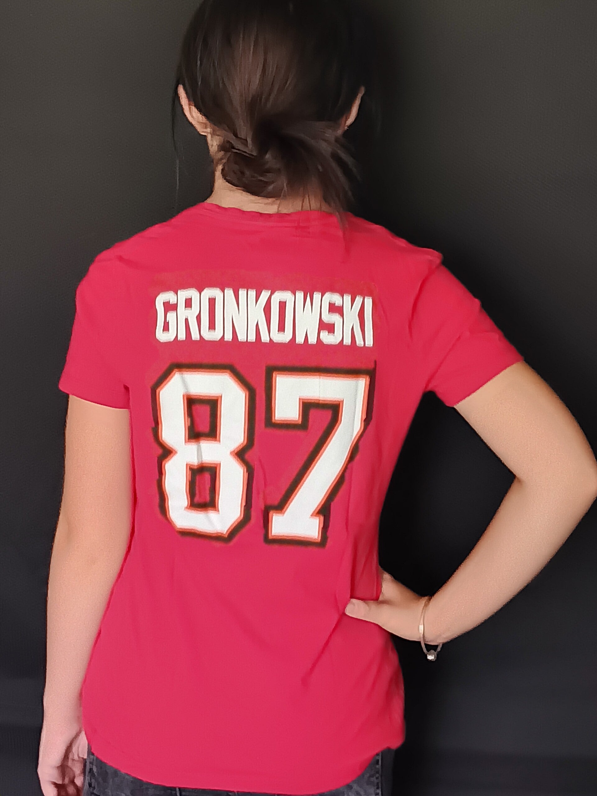 Ladies V-neck Buccaneer Red Shirt, Flash back to 2021 when, Gronkowski # 87 helped Brady win the Superbowl for Tampa Bay.