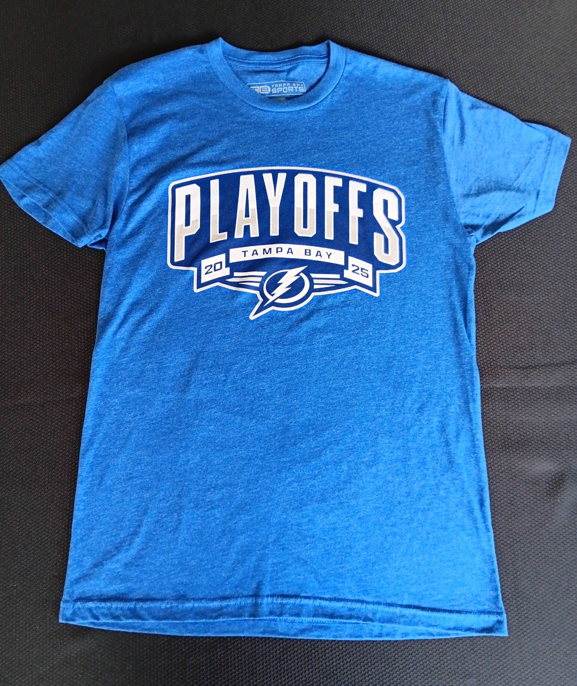 Men's 2025 Lighting Playoff Blue Shirt. Graphic Symbol on front and back in plain.