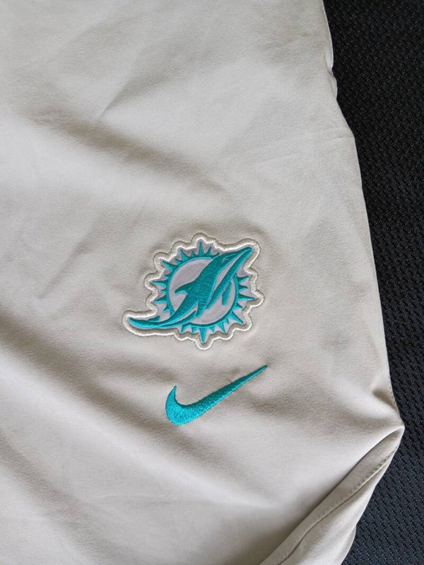 New Men's Nike Pants. Elastic waist with draw string, fully lined with polyester material. Has side pockets and 1 back pocket on right side. On right leg has the Dolphin Symbol in teal with the Nike symbol direct beneath it also in teal. NFL symbol in teal on right leg. Bottom of legs have zippers on the sides. Original price $65.00