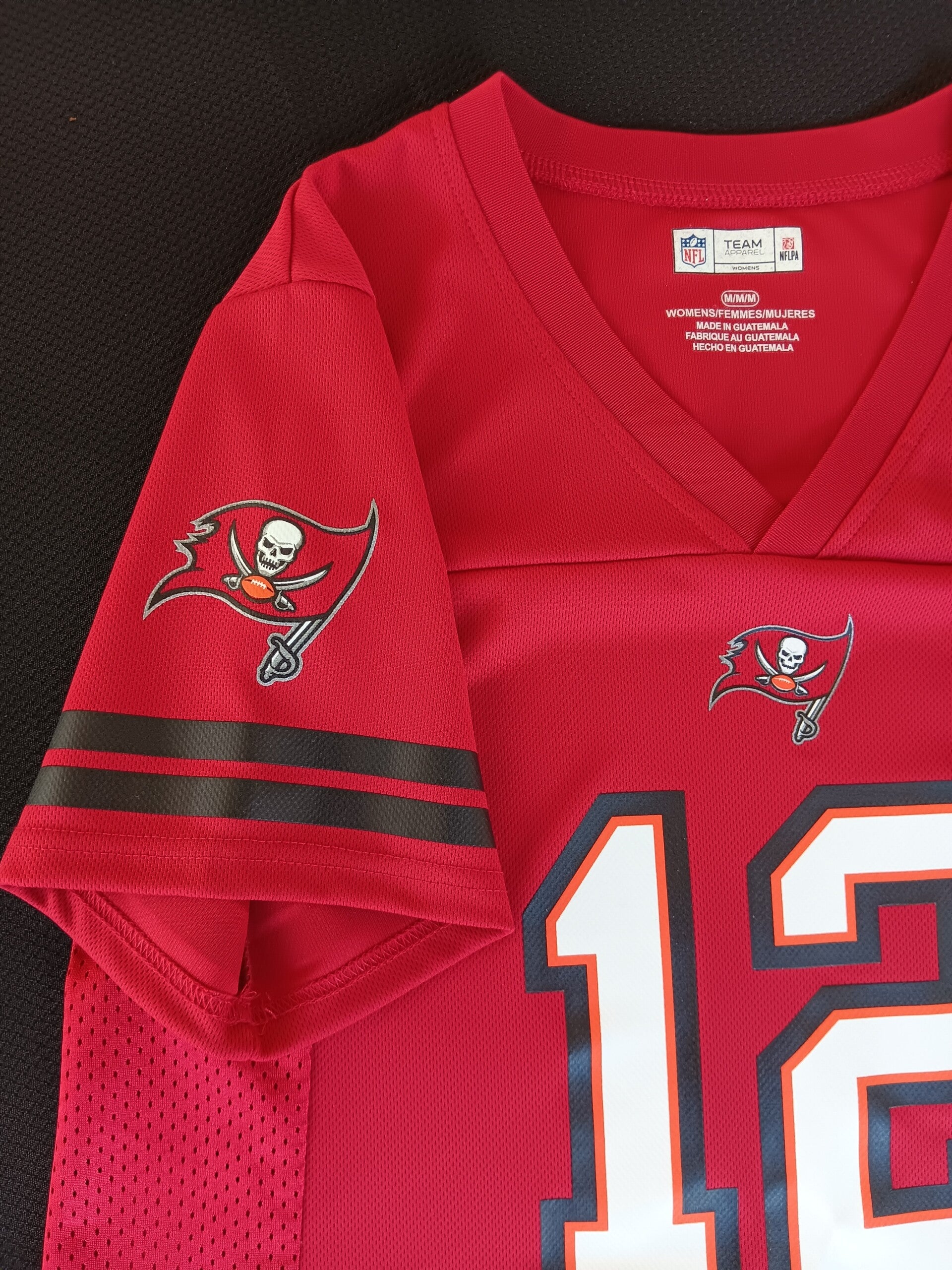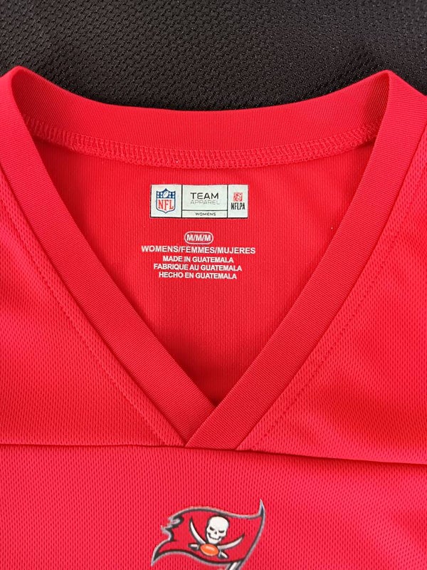 Lady's NFL Apparel Jersy # 12 Tom Brady who played for the Buccaneers 2020 - 2022 Winning the Superbowl in 2021. The Jersey Jas 12 on front and back. Front bottm left hand corner has NFLPA patch. Buccaneer Flag on both arms with 2 black stripes. Brady is written across the shoulders on the back.