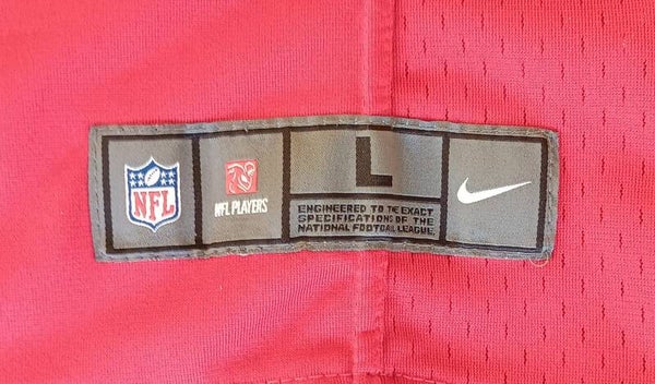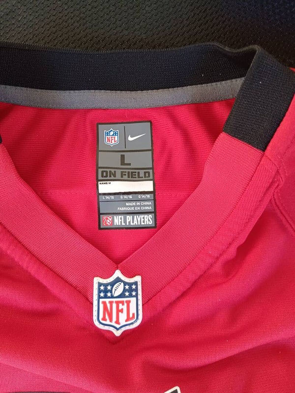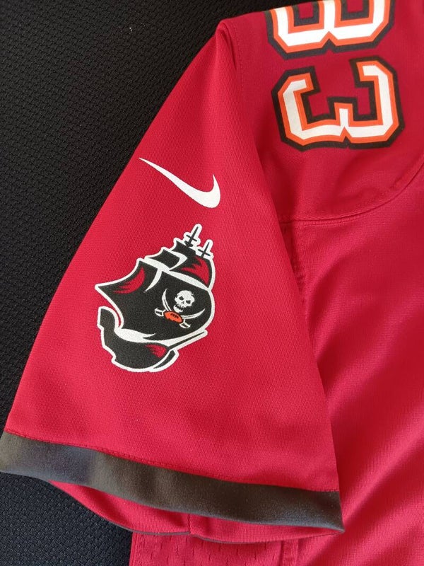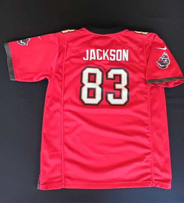 Youth Nike NFL Apparel Jersy # 83 Vincent Jackson who played for the Buccaneers 2012 - 2016 holding the wide receiver position. The Jersey has 83 on front, back and both shoulders. Buccaneer Flagship on both arms with Black NIKE symbol over the ships. Both sleeves are cuffed with black band. Jackson is across the shoulders on the back. NFL symbol is at the crest of the v-neck in the front. Exterior size label on front lower left hand side of front.