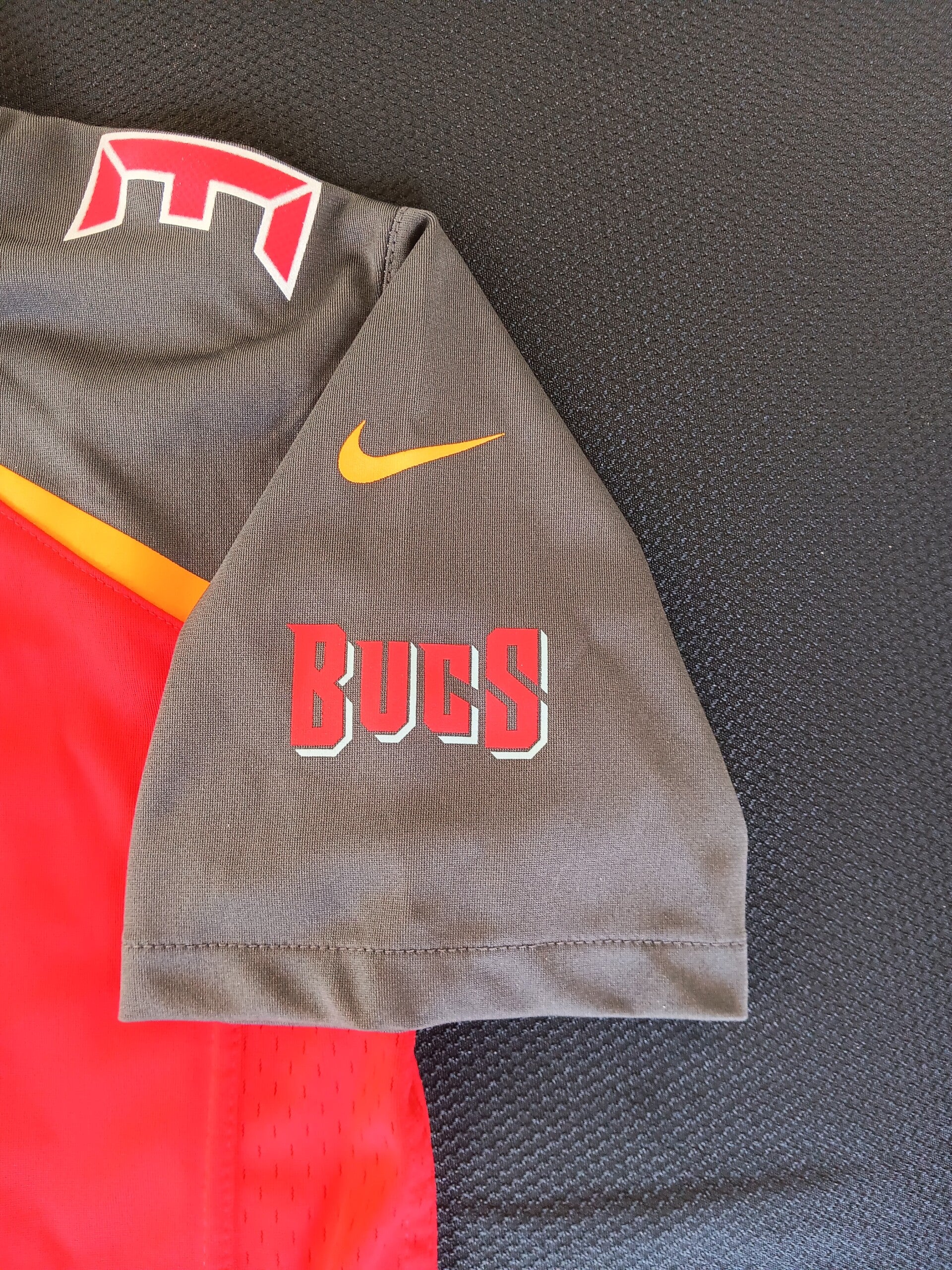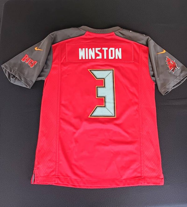 Youth Nike NFL Apparel Jersy # 3 James Winston who played for the Buccaneers 2015 - 2019 holding the quarterback position. The Jersey has 3 on front, back and both shoulders. Red/Black Buccaneer Flagship on the right arm & BUCS in red in on the left arm with orange NIKE symbol over both Bucaneer symbols. Winston is across the shoulders on the back. NFL symbol is at the crest of the v-neck in the front. Exterior size label on front lower left hand side of front.