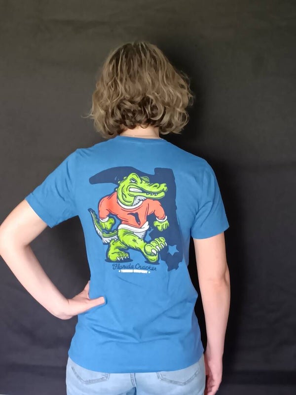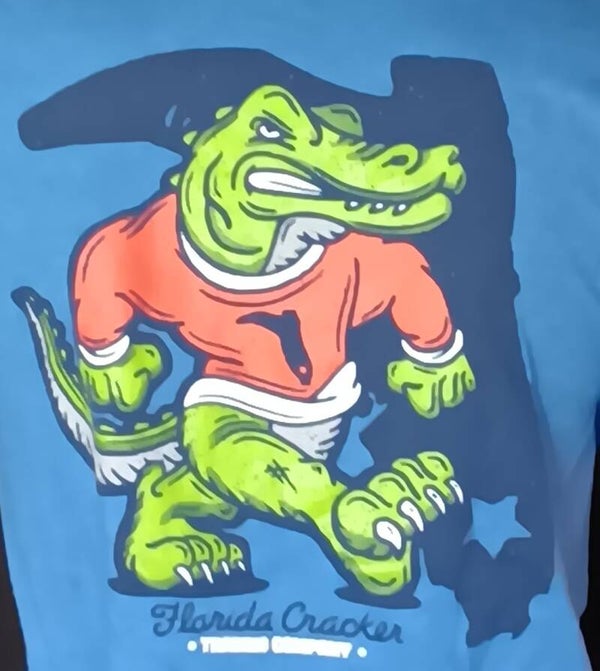 This Medium shirt by Florida Cracker Tading Company pays Homage to University of Florida Gators featuring on the front top left side an orange and blue football helmet with the Florida Cracker logo. On the back has a Gator wearing an orange jersey with the Florida Cracker logo on the jersy and background. While it nowhere says Gators - still a great shirt from an awesome company.