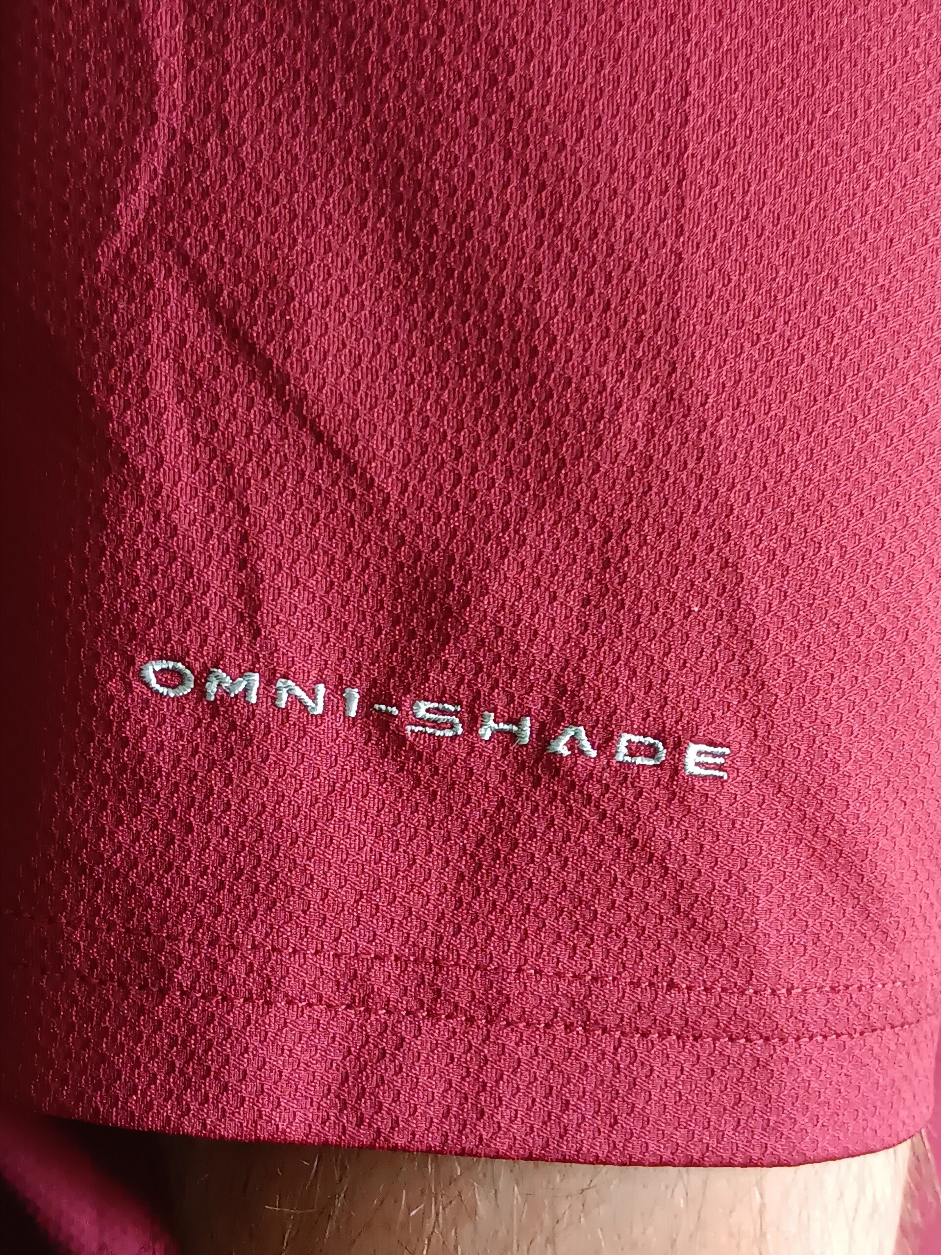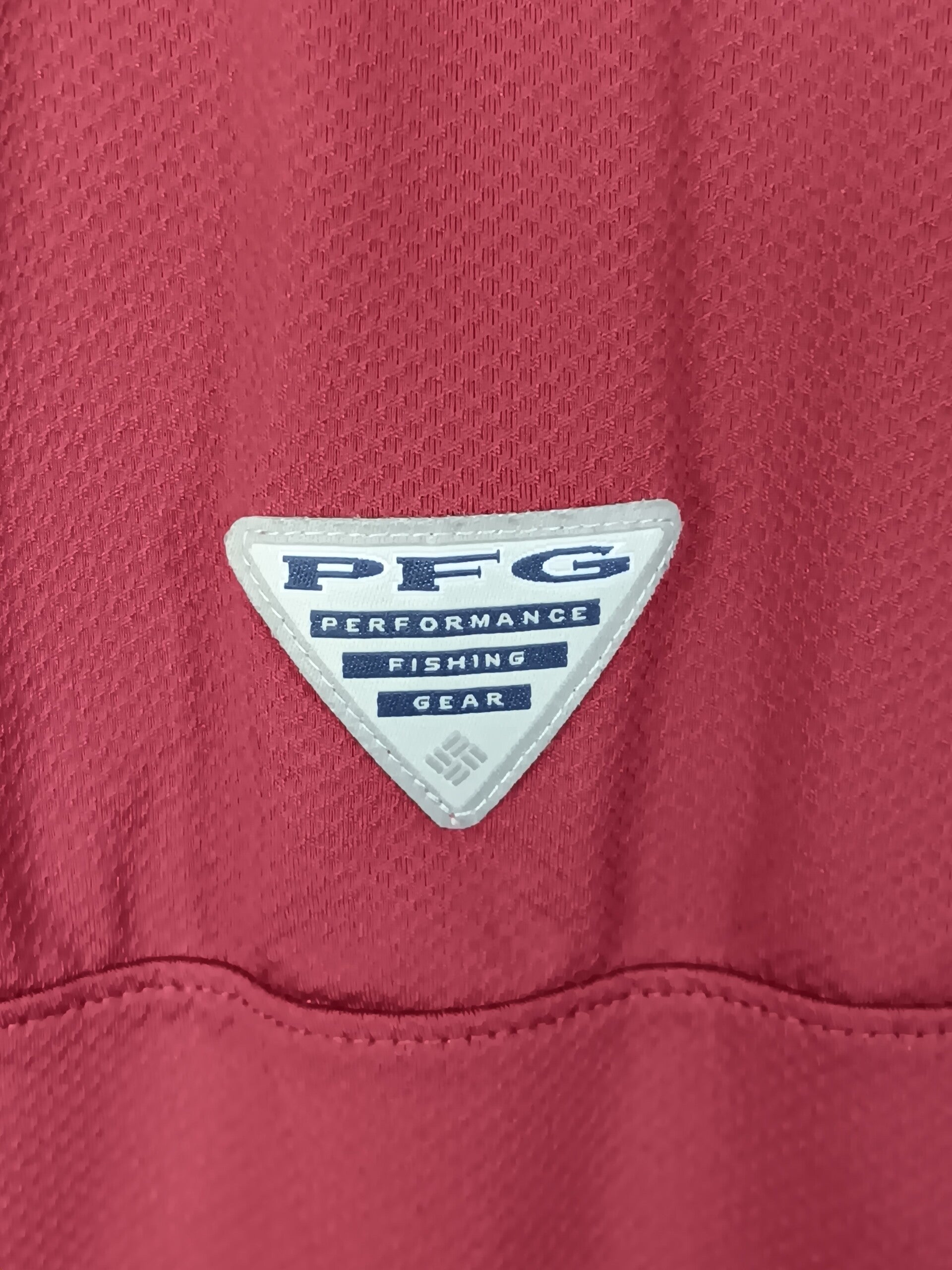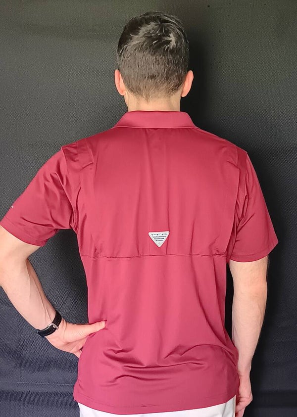 Maroon Men's Columbia collar shirt. PFG - Performance Fishing Gear with Omi Shade. Front features Florida State Seminole logo stitched on front left breast and Columbia FPG stitched on the right side. On left arm "Omni - Shade" is stitched. Back PFG patch.
