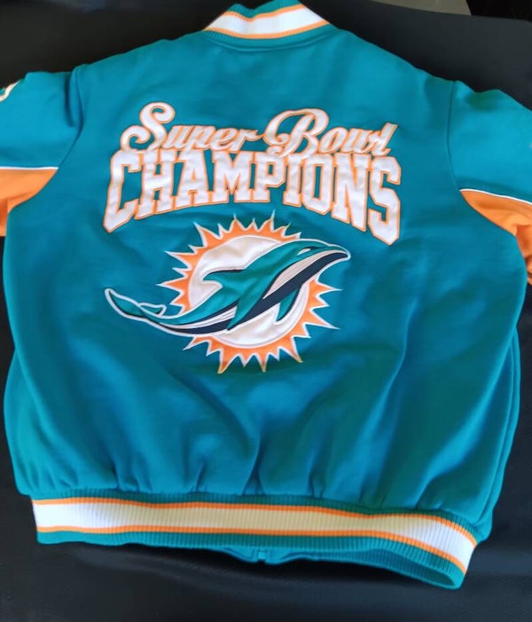 Experience the legacy of the Miami Dolphins with this classic 'Dolphins '72 '73' Super Bowl Jacket. A must-have for any true football aficionado, it's a stylish nod to the team's legendary Super Bowl seasons. Proudly sporting the iconic colors and logo, this jacket is an officially licensed NFL product, ensuring authenticity and quality. Crafted for comfort and durability, this jacket is sized 2XL, making it a great fit for a variety of body types. Whether you're at the game or out on the town, it's the perfect way to show your support for the Dolphins and the proud tradition of Super Bowl VII and VII.