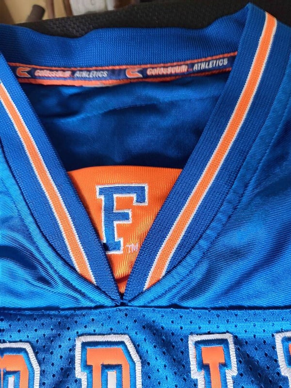 University of Florida blue Jersey with Orange accents. Front features left top Gator logo, "F" at the bottom of the v-neck, the word "FLORIDA" across the chest with #1 and 2 patches on the bottom left side featuring "Offically Licensed Collegiate Product" and College Equipment. Both arms feature white and orange banding and the #1. Back features "GATORS" and the #1 Everything on this Jersy is stitched.