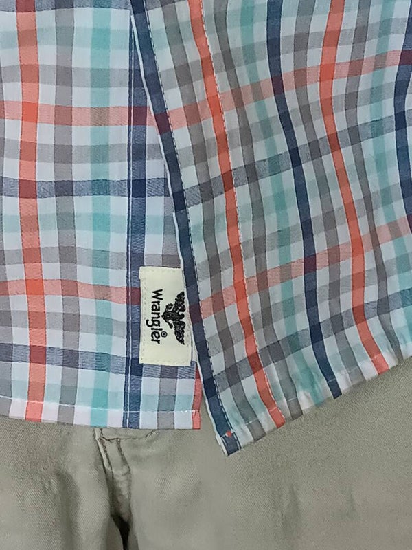 Wrangler men's plaid short sleeve shirt featuring the Orange and Aqua of the Miami Dolphins. At work and want to support your team..... here's your answer without wearing a Dolphin logo shirt - Be that Next - Level - Employee/Fan.