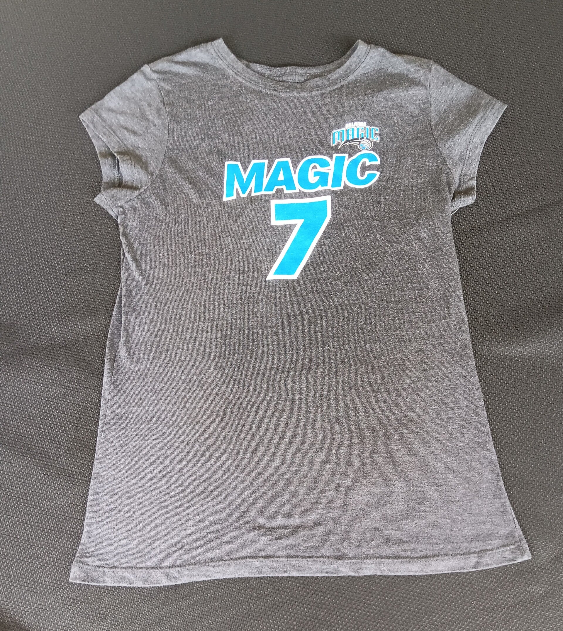 Lady's t-shirt with capped sleeves, featuring #7 Jonathan "JJ" Redick who played with the Orlando Magic from 2006 - 2013. Played a significant role in the Magic's run for the 2009 NBA Finals. Front features Magic #7 & the back has Redick's name and #7. The graphics are printed not stitched on the shirt.