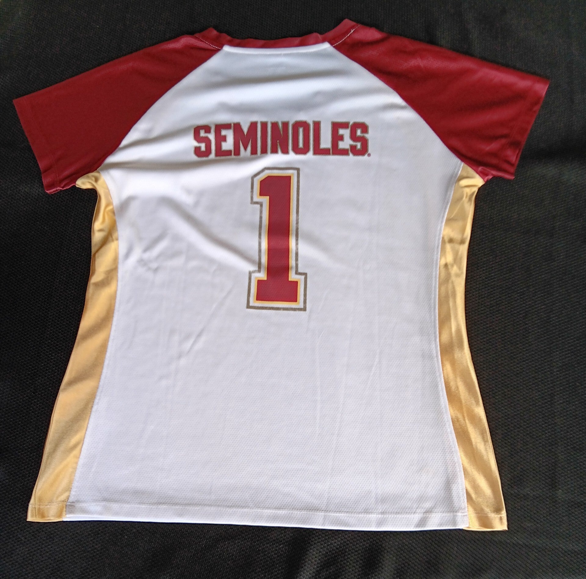 Lady's FSU Jersey featuring satin inserts in the arms/shoulders and sides. Front has Florida State Seminoles in garnet and silver along with the team logo. Back features Seminole "1"