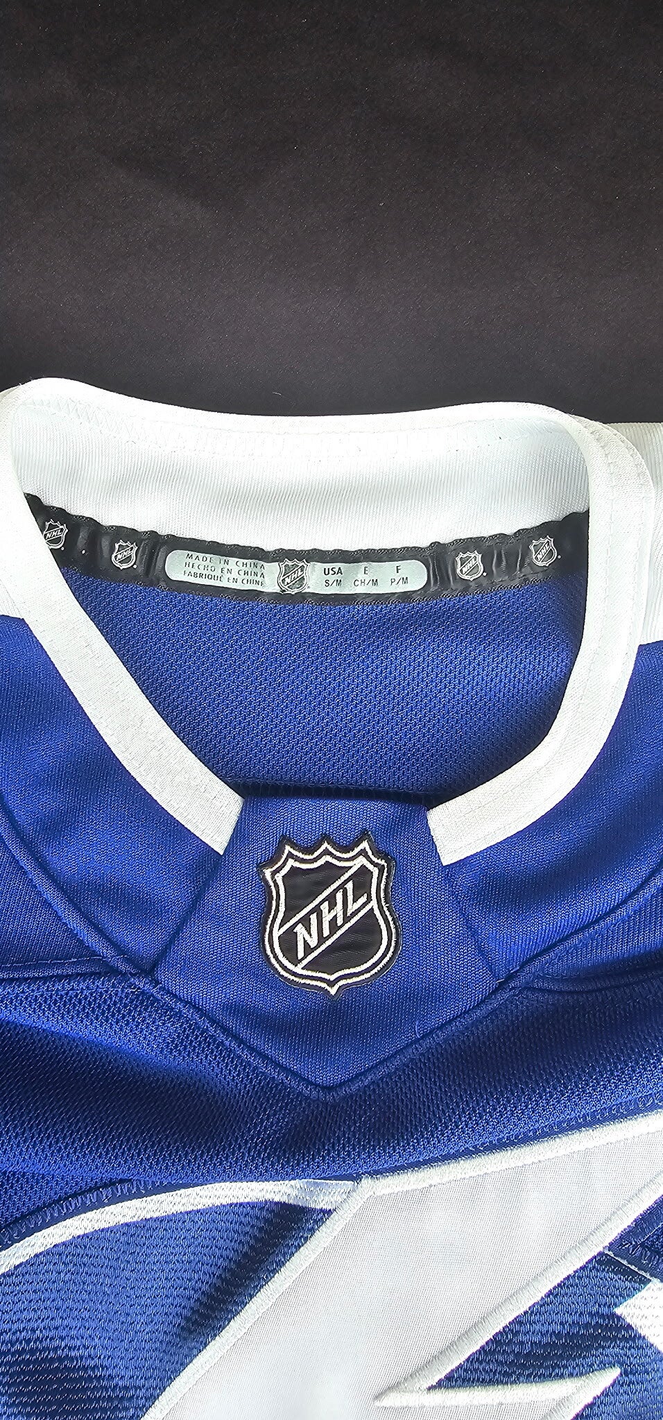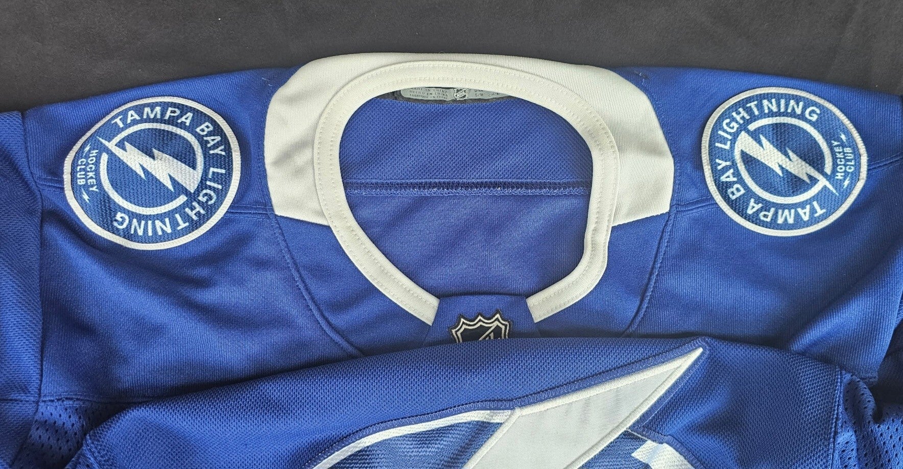 NHL Tampa Bay Lighting Woman Jersey featuring no player making this Jersey timeless. The Jersey is tagged as Offical Licensed Product ofthe NHL (see picture). Front feature NFL Equipment patch at neck, stitched Lighting graphic. Both shoulders have Tampa Bay Lighting Hockey Club patches.